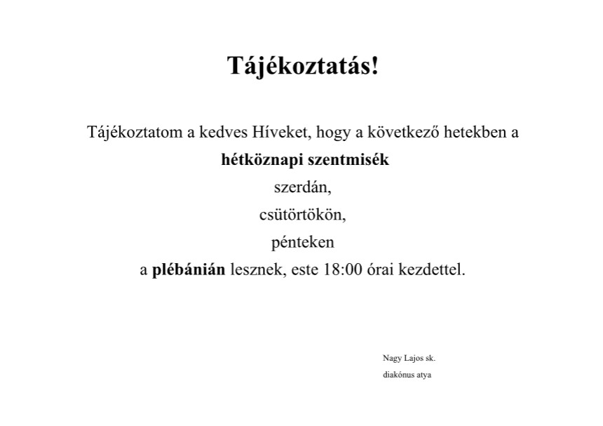 Az esti szentmise időpontja a továbbiakban is változatlan: